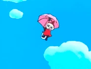 Little My later meets up with Moomin, Snufkin, Sniff and Snorkmaiden on the Moominhouse veranda discussing the Snork's Flying Ship, to which Little My is skeptical about. She the comments on Sniffs eating habits, as pink clouds starts to come out of the house. She and the others decide to jump on them and fly around. She and Sniff has a competition, by flying into each other until one falls off: Little My wins. As the clouds start to disappear, Little My is disappointed as she was not done playing with it.