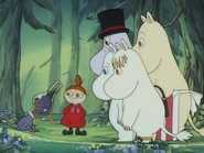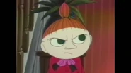 Afterwards the five friends decide to play hide-and-go-seek. Little My decides to hide in a pot in Moominamma's kitchen and scares Sniff as he finds her. She was the second to last to be found, as Moomin was not yet found. Everyone speculates on where Moomin could be, as they start to hear laughter coming from the large hat Moomin found in The Lonely Mountains earlier. Moomin come out, transformed into a creature and everyone wonders who he is. Little My watches on as Moomin starts to panic and Moominmamma arrives, being confronted by the transformed Moomin. Moominmamma recognizes him and he turns back into Moomin. Little My is last seen with everyone looking at the magic hat.