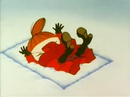 Little My is first seen sleeping in her bed in the Moominhouse during winter. As spring arrives she is awoken by Moomin as he shouts in joy the arrival of spring. As Moomin runs down stairs Little My confronts him about this and explains that she had a nice dream where she lived in a watermelon. Moomin explains himself by saying that Little My told Moomin before they went for their winter sleep that Little My asked Moomin to wake her up on the first they of Spring, which she struggles to remember. Moomin also says that her sister, the Mymble, will probably return home soon. Just then Moominmamma enters the hallway. Little My says she is hungry and asks if she has any watermelon, to which Moominmamma says that she doesn't and that she will start making breakfast, not including watermelon. Little My and Moomin then hears Snufkin's harmonica and Little My heads down stairs while Moomin runs up and out trough his window. As they meet outside, Little My comments that the stairs are faster, but Moomin says his window is more fun. As they run towards Snufkin, Little My says she will go see if her Sister has arrived and heads to her house.
