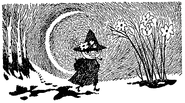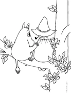 Snufkin always wears a dark green hat with a wide brim and a similarly coloured, shabby old coat. He first joins the Moomins on their adventures in the book Comet in Moominland."