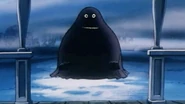 The first "Groke" appears in Episode 4 as a one-off character called "Licky-Licky". Licky-Licky bears the closest resemblance to traditional depictions of the Groke in appearance, but seems to be an entirely different character altogether, being completely belligerent in nature and lacking her heat sink-like abilities. Instead, it tries to attack people by licking their faces off, often flapping its large green tongue while shouting "Pero pero pero!" (Japanese onomatopoeia for licking) Moomin and Snufkin manage to ward off the creature by having the former wear a mask made of mustard-coated bread, causing the creature to lick it and convulse in pain and disgust from the flavor. Licky-Licky did not appear again after this, presumably because Tove did not approve of this portrayal of the character.