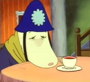 The Police Inspector appears as a white Hemulen. He wears a dark blue custodian helmet, a yellow scarf, a blue jacket with white buttons and black trousers.